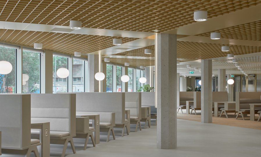 Carefully dismantling the structure revealed a beautiful basis for further work: an elegant 6,200m2 concrete skeleton complete with monumental octagonal columns and column heads that were eminently suited to a new, open-plan organisation. In order to preserve the raw beauty of the structure and maximise the experience of space, the new installations are left in plain sight.