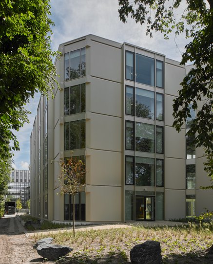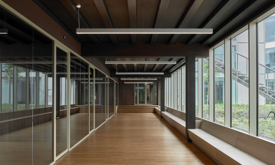 The new office will house more than 500 employees. It was initially thought that further space would be needed in other buildings and by adding a sizeable new extension that would increase the building’s footprint. However, we found it important to preserve the existing footprint and did so by adding a lightweight, sustainable wooden volume, constructed on circular principles, to the U-shaped void of the original design.